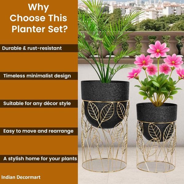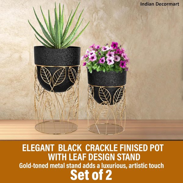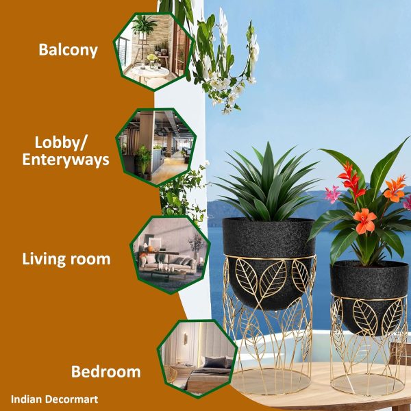 ELEGANT METAL PLANTER WITH GOLDEN STAND – The modern black metal pot paired with a golden leaf design planter stand enhances the beauty of any room. A perfect metal pot with stand for living rooms, offices, and home decor setups.