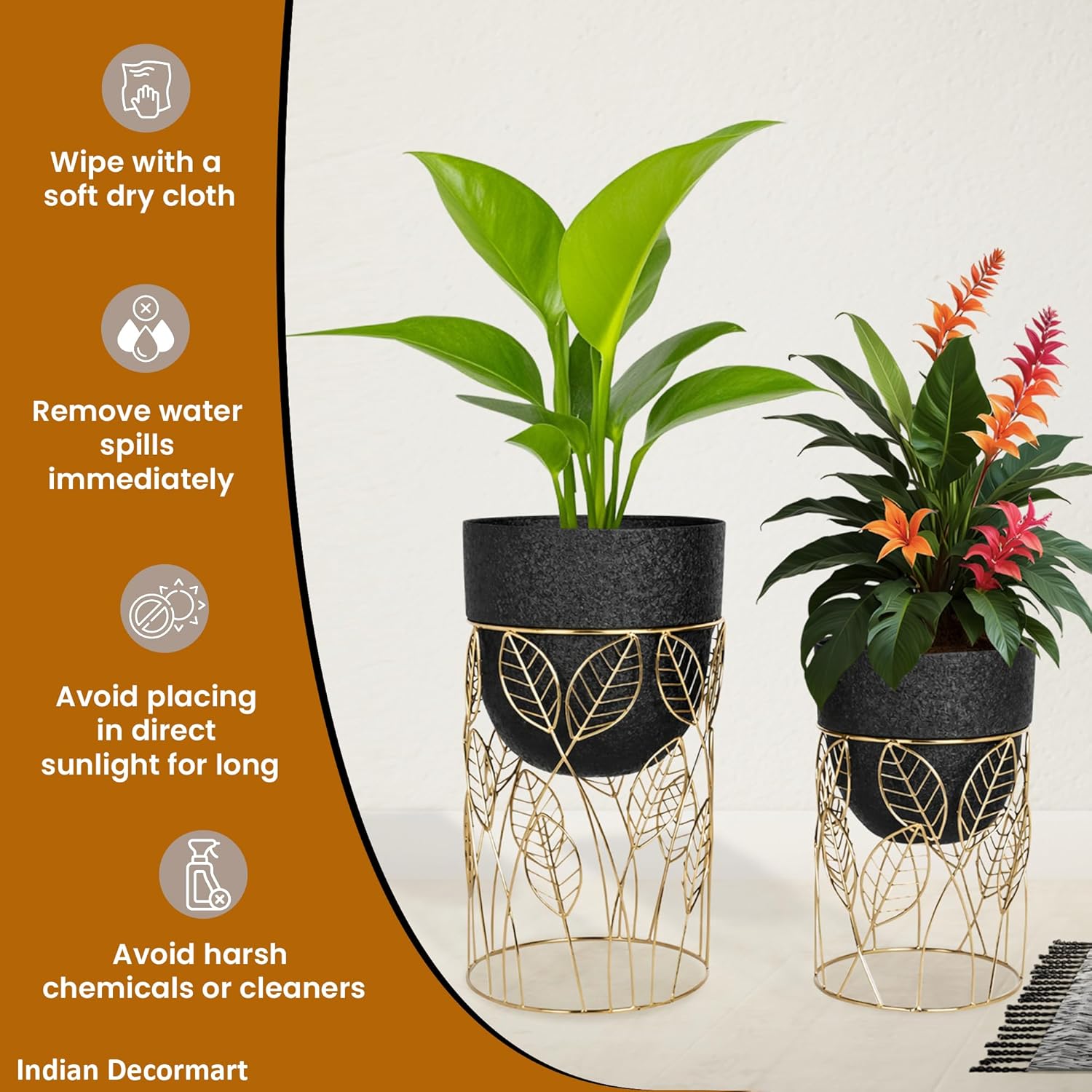 ELEGANT METAL PLANTER WITH GOLDEN STAND – The modern black metal pot paired with a golden leaf design planter stand enhances the beauty of any room. A perfect metal pot with stand for living rooms, offices, and home decor setups.