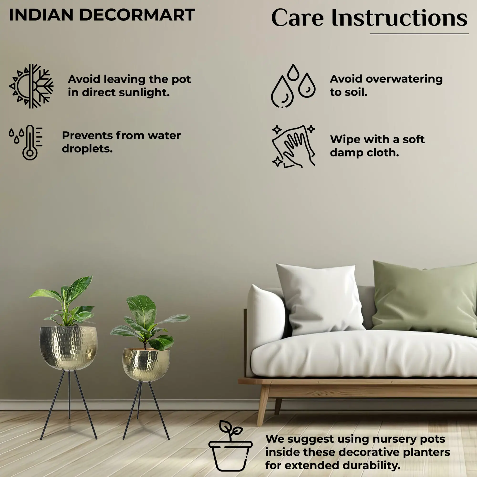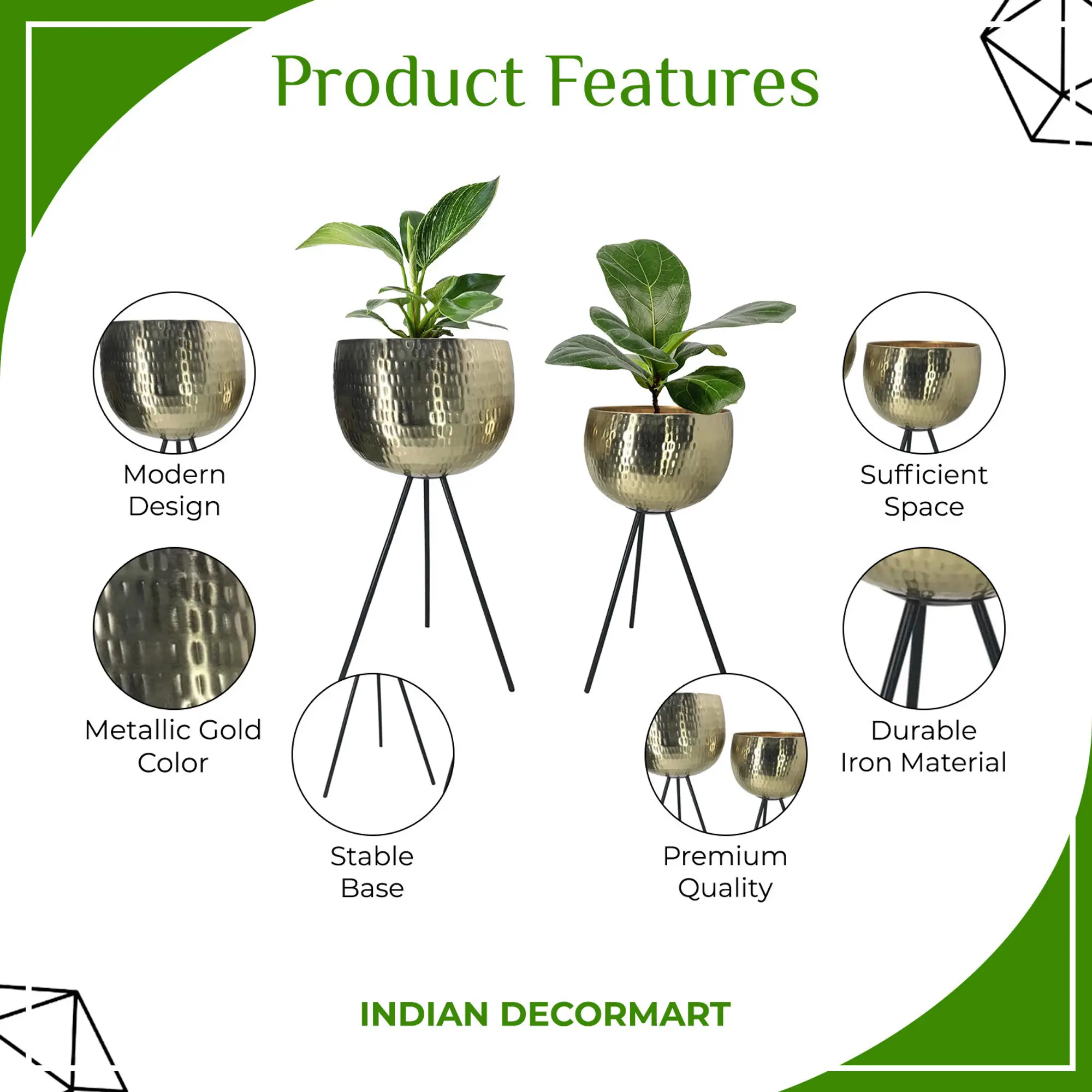 Indian Decomart Metal Planter with Stand - Elegant Plant Container Set Enhance your home decor with the elegant Indian Decomart METAL PLANTER with STAND, a perfect addition to any indoor or outdoor space. This stylish plant container set features a durable metal planter combined with a sleek stand, ensuring stability and a modern aesthetic. Ideal for showcasing your favorite plants, the metal planter is both rust-resistant and weatherproof, making it perfect for various environments. The elevated design promotes healthier plant growth by improving drainage and air circulation. Great for succulents, flowers, and herbs, this decorative plant stand complements any decor style.