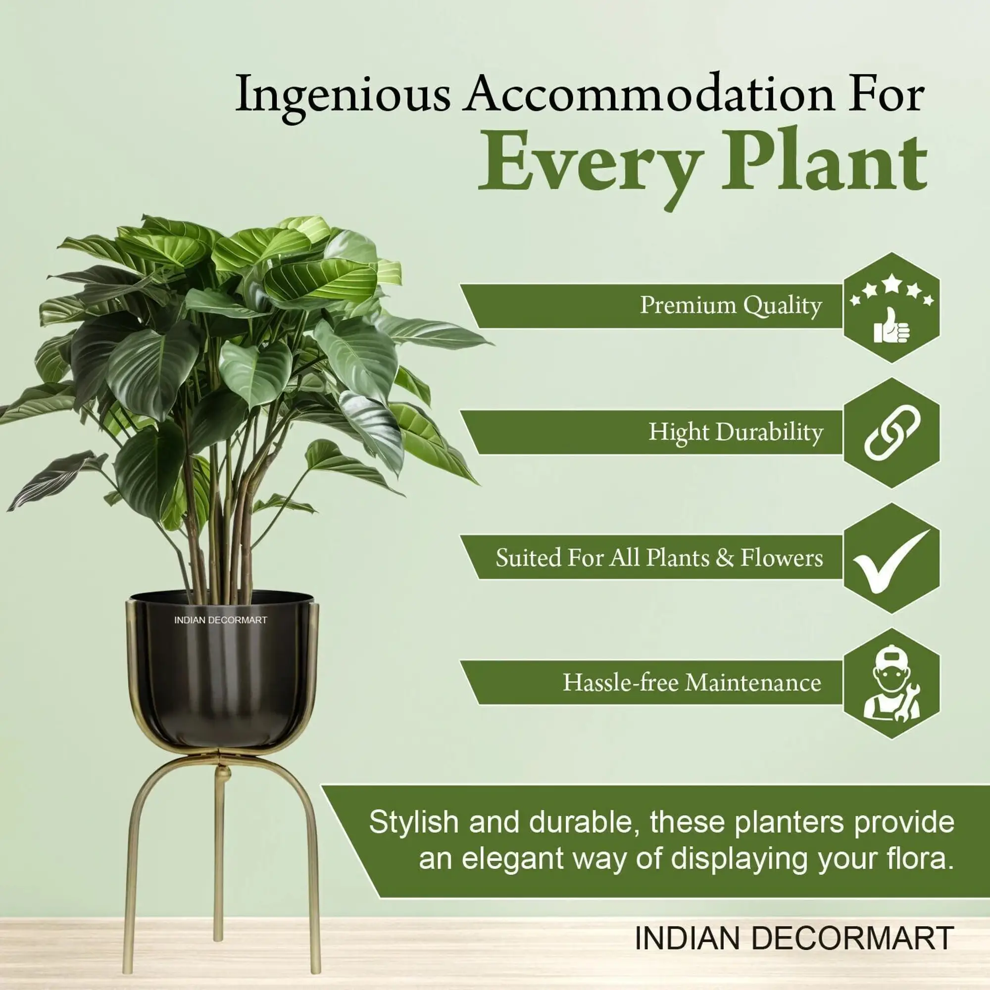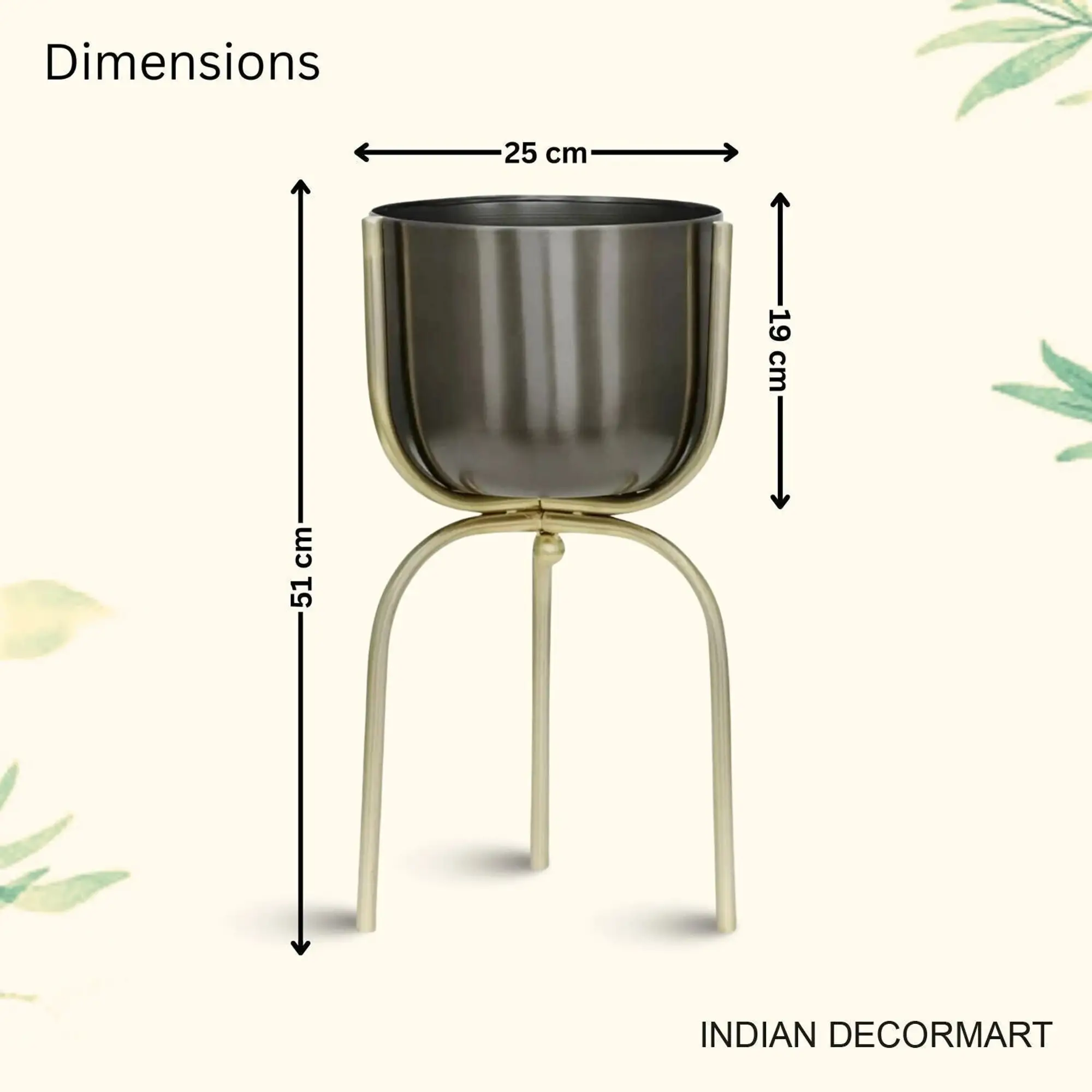 Indian Decomart Metal Planter with Stand – Elegant Plant Container Set Enhance your home decor with the elegant Indian Decomart METAL PLANTER with STAND, a perfect addition to any indoor or outdoor space. This stylish plant container set features a durable metal planter combined with a sleek stand, ensuring stability and a modern aesthetic. Ideal for showcasing your favorite plants, the metal planter is both rust-resistant and weatherproof, making it perfect for various environments. The elevated design promotes healthier plant growth by improving drainage and air circulation. Great for succulents, flowers, and herbs, this decorative plant stand complements any decor style.
