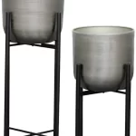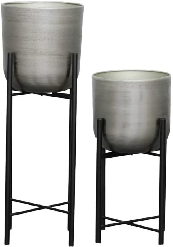 This is a Modern and Stylish Planter suitable for any corner of your Home. In this set, there are Two Pots and Two stands. The Pots have texture design in Silver Color and Stands are Black. Dimensions: Big Planter with Stand: Diameter-26CM, Height-73CM; Small Planter with stand: Diameter-23cm, Height-48CM. ONLY BIG POT-HEIGHT-26CM; DIAMETER-26CM. ONLY SMALL POT-HEIGHT-22CM; DIAMTER-23CM. Stable Structure, High Durability, Simple and Elegant Design, Premium Quality. Instructions for Longer Life of Metal Planters: We recommend using nursery pots to place inside these metal planters. We recommend placing these planters indoor or in porch area to prevent these from direct rain. Wipe with a soft damp cloth and ensure no water droplets stay on the planters. Do not over water the plant.