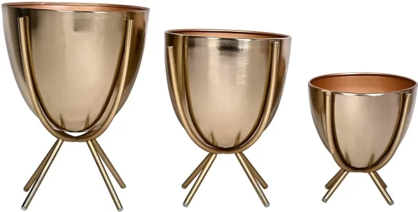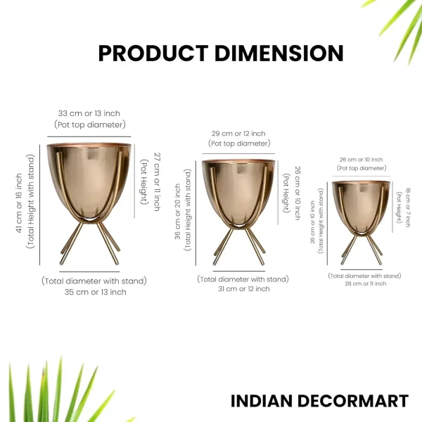 This is a Metal Planter Set of 3. In this set, there will be 3 pots and 3 stands. DIMENSIONS – BIG PLANTER WITH STAND – HEIGHT:43CM, DIAMETER:31CM; MEDIUM PLANTER WITH STAND – HEIGHT:35CM, DIAMETER:28CM; SMALL PLANTER WITH STAND – HEIGHT-26CM, DIAMTER-23CM. ONLY BIG POT-HEIGHT-28CM, DIAMTER-30CM. ONLY MEDIUM POT-HEIGHT-25CM; DIAMETER-28CM. ONLY SMALL POT-HEIGHT-18CM; DIAMTER-22CM. It is beautiful planter which can be used in any corner of your Home or Garden. Stable Structure, High Durability, Simple and Elegant Design, Premium Quality. Instructions for Longer Life of Metal Planters: We recommend using nursery pots to place inside these metal planters. We recommend placing these planters indoor or in porch area to prevent these from direct rain. Wipe with a soft damp cloth and ensure no water droplets stay on the planters. Do not over water the plant.